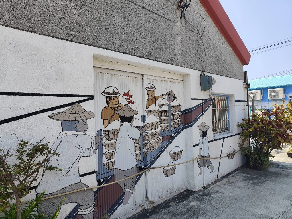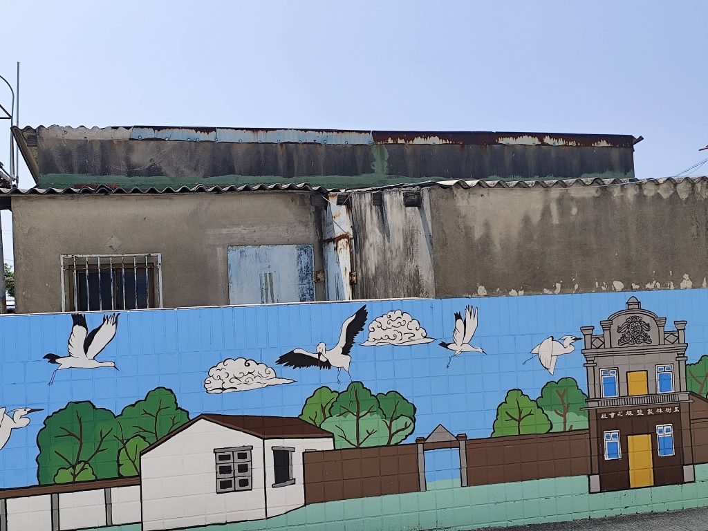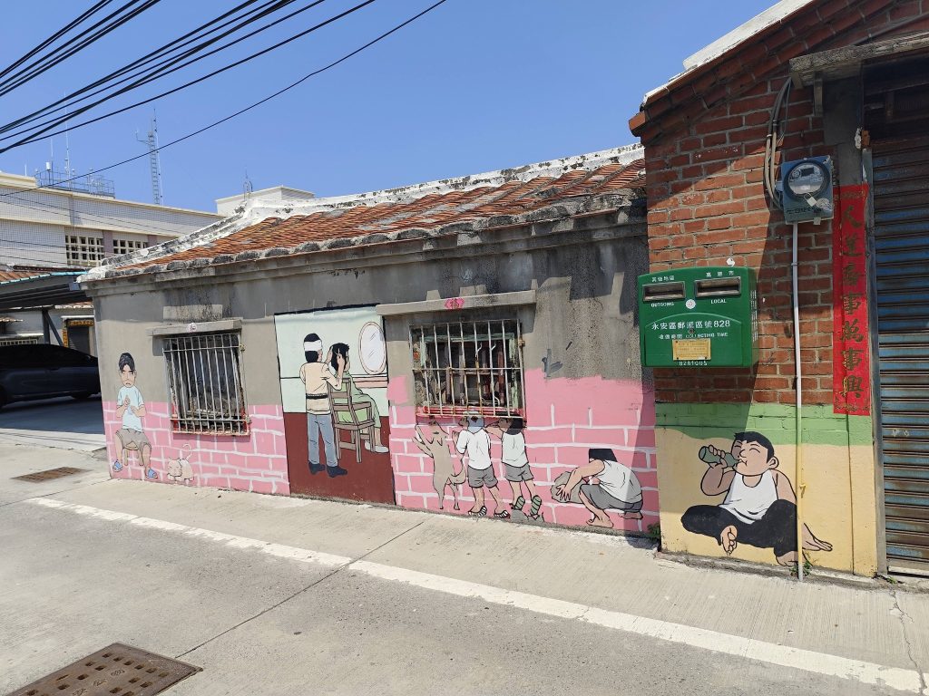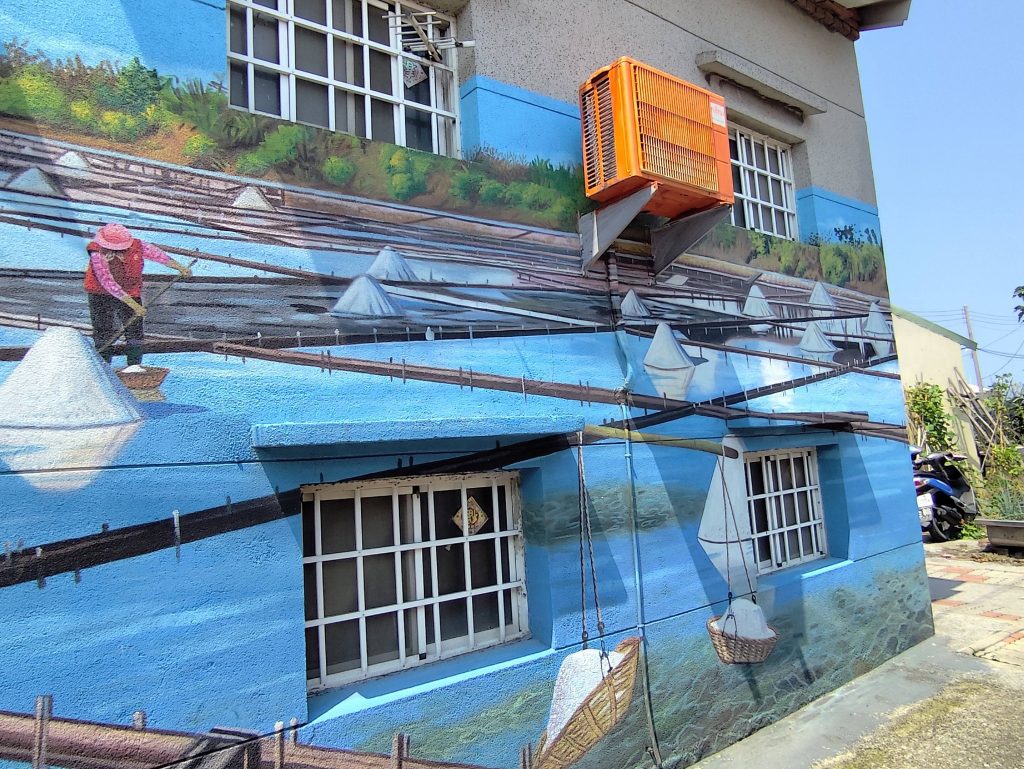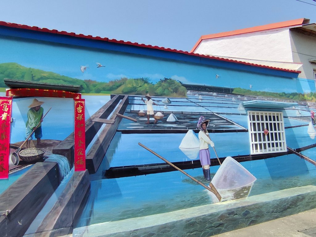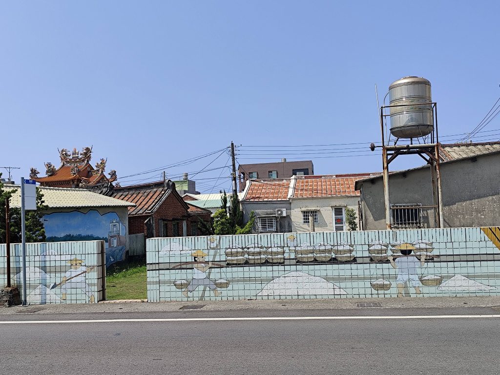 永安鹽田彩繪村一遊 難得老妹休年假便要老弟開車帶我們一遊商討老半天決定到高雄永安早上一上車老弟就苦著張臉一直唸叨:”油好貴!"每當導航報錯路就直說:”浪費10元油錢" 終於來到永安鹽田了 彩繪村就在對面 從這進來 可愛彩繪 明顯畫風不同 還有這古老建築 特有古老花磚 屋頂上特有花磚 舊式水池 老浴缸 翻修鐵皮屋 整個村里有多處魚塭 漂亮廁所 宮廟 小小的但裝修精緻 交趾燒屋頂 陽光好大是個好天氣 逛著逛著看著琳琅滿目鹽田彩繪村 也是滿足開心!